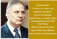 Σήμερα Κυριακή 22 Ιουνίου στις 7.30 μμ η ομιλία με θέμα “Η ισότητα του γάμου των ομόφυλων ζευγαριών” από τον Αντιπρόεδρο Αρείου Πάγου ε.τ. Νικόλαο Ζαΐρη
