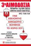 Ο σύλλογος εθελοντών αιμοδοτών Παναγιούδας σας προσκαλεί στην 3η εθελοντική αιμοδοσία την Τετάρτη 10 Σεπτεμβρίου 2025 και ώρες από 17:00 έως 21:00 στο δημοτικό …